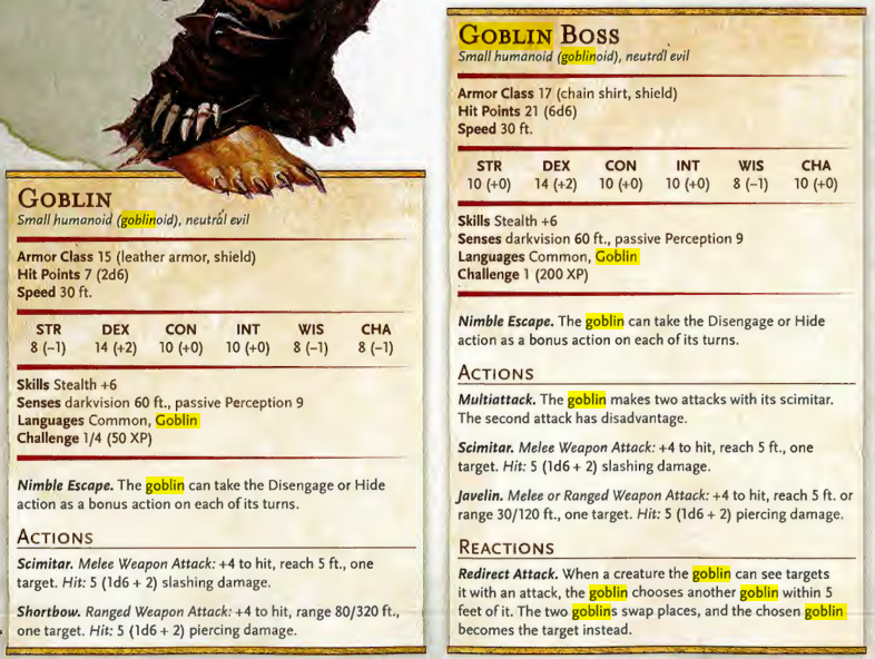Goblins are small, black-hearted, selfish humanoids that lair in caves, abandoned mines, despoiled dungeons, and other dismal settings. Individually weak, goblins gather in large- sometimes overwhelming- numbers. They crave power and regularly abuse whatever authority they obtain.